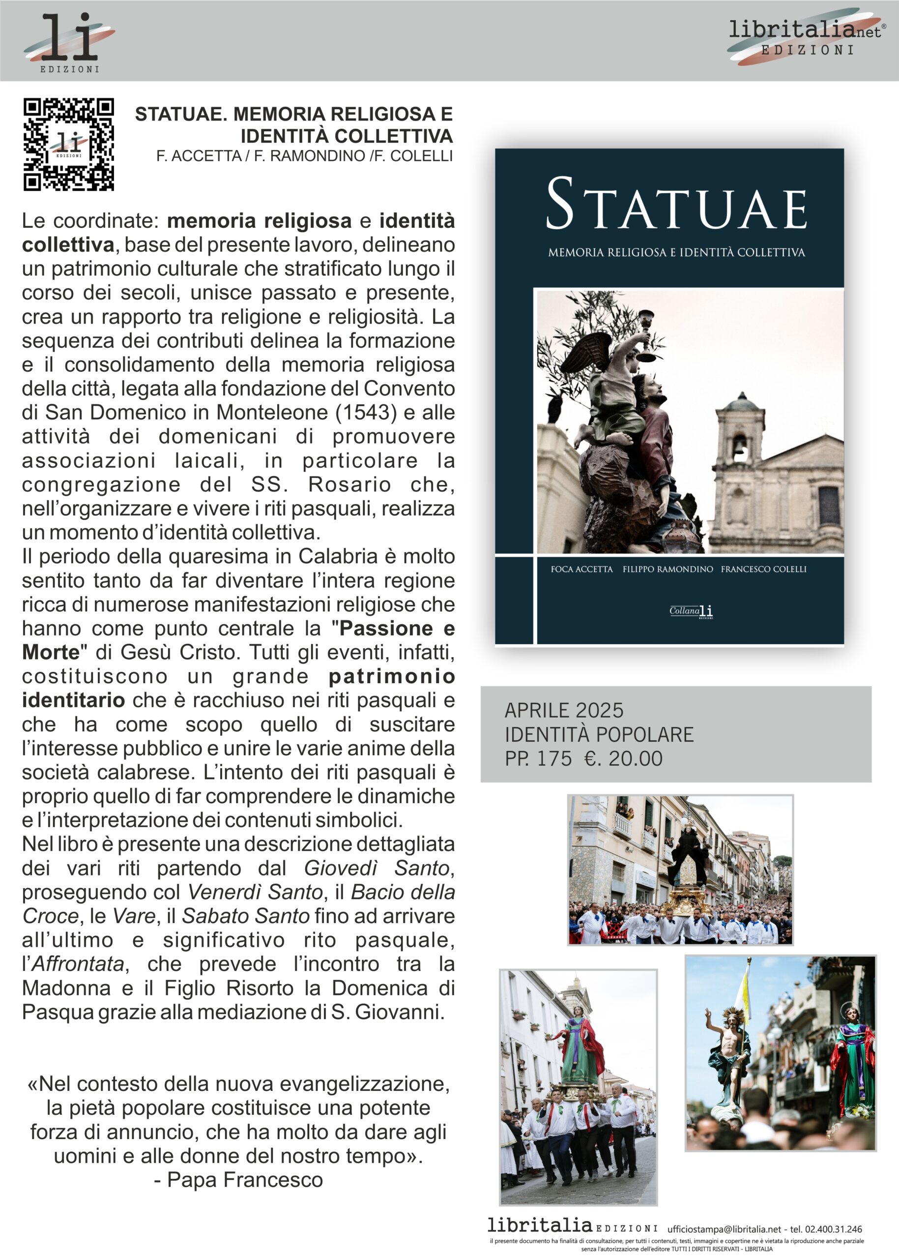Statuae - Memoria religiosa e identità collettiva a cura di Foca Accetta, Filippo Ramondino, Francesco Colelli. Galleria Fotografica a cura di Franco Grillo e Attilio Scullari, edito da Libritalia Collana Li Edizioni